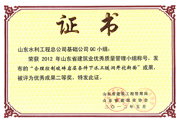 公司“合理控制破碎巖層條件下水工程隧洞開挖斷面”等兩項(xiàng)成果榮獲2012年山東省建筑業(yè)優(yōu)秀質(zhì)量管理優(yōu)秀成果二等獎(jiǎng)