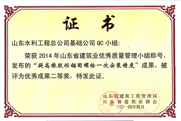 公司“提高橡膠壩錨固螺栓一次安裝精度”榮獲2014年山東省建筑業(yè)優(yōu)秀質(zhì)量管理優(yōu)秀成果二等獎