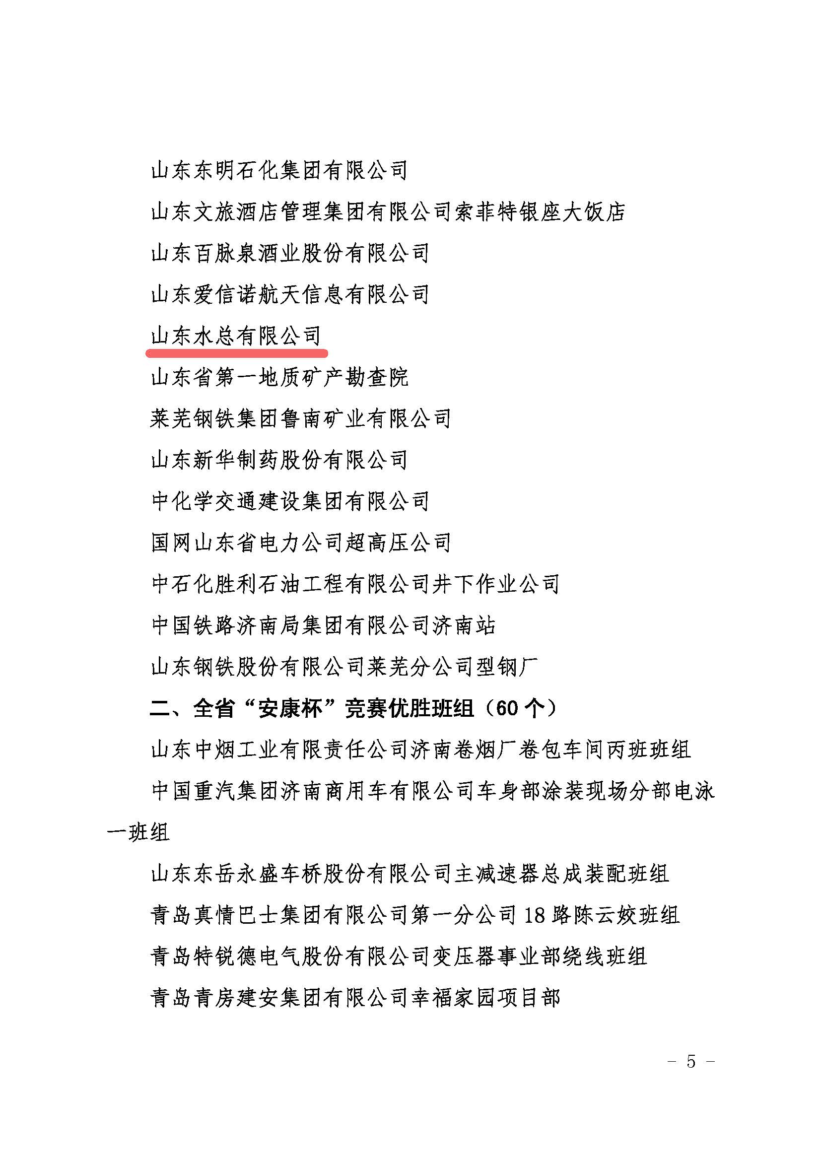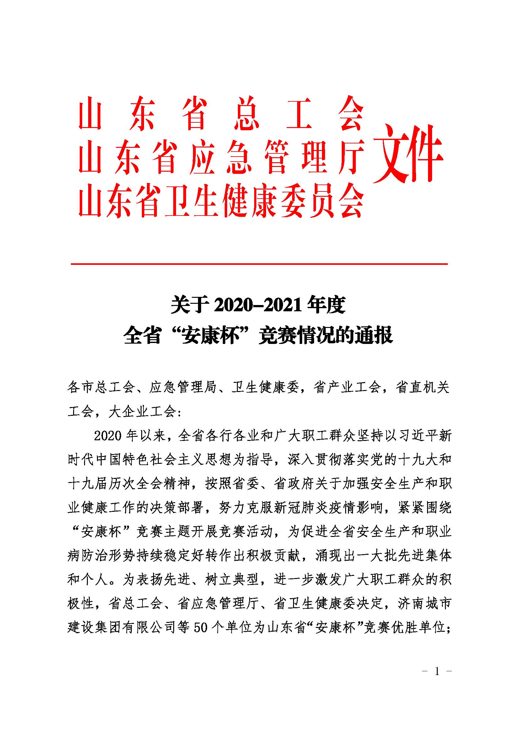 近日,山東省總工會、山東省應(yīng)急管理廳和山東省衛(wèi)生健康委員會聯(lián)合印發(fā)文件,通報了2020-2021年度全省“安康杯”競賽活動結(jié)果,山東水總有限公司榮獲全省“安康杯”競賽優(yōu)勝單位稱號。