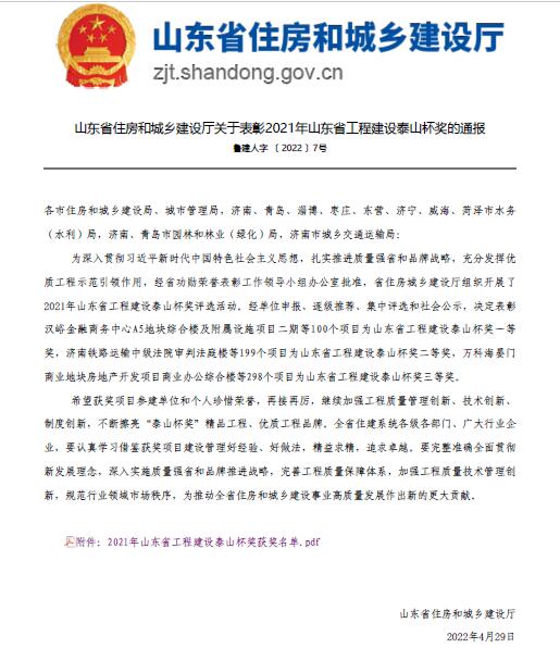 公司兩項(xiàng)工程榮獲2021年度“山東省工程建設(shè)泰山杯獎(jiǎng)”