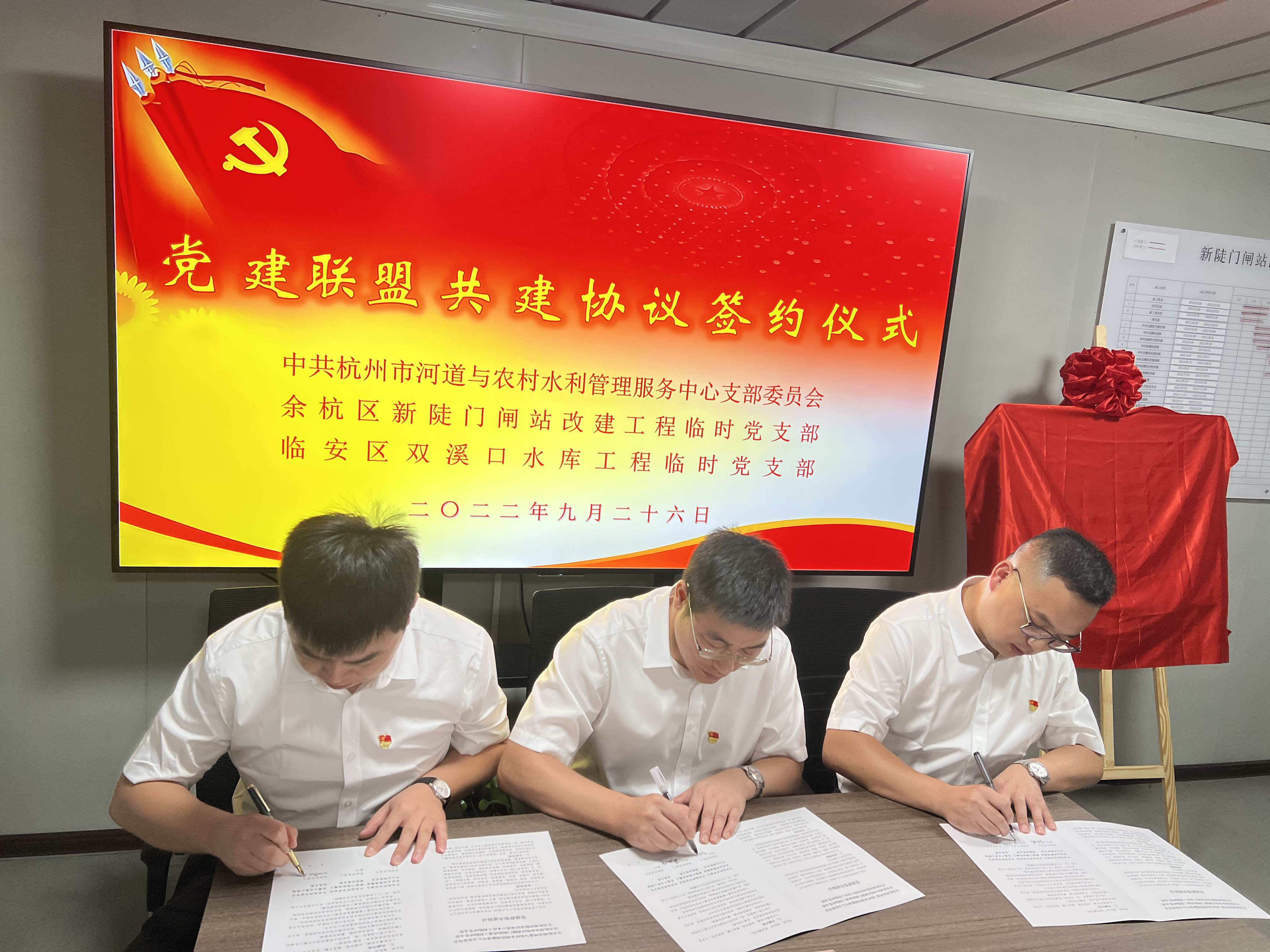 9月26日,中共杭州市河道與農(nóng)村水利管理服務(wù)中心支部委員會、中共杭州市余杭區(qū)新陡門閘站改建工程臨時(shí)黨支部、中共杭州市臨安區(qū)雙溪口水庫工程臨時(shí)黨支部在新陡門閘站改建工程現(xiàn)場舉行黨建聯(lián)建協(xié)議簽約儀式。市農(nóng)水中心支部書記、主任葉利偉,余杭區(qū)林水局黨委委員、二級調(diào)研員徐偉林,臨安水利局機(jī)關(guān)黨委副書記、紀(jì)檢書記劉勇,新陡門閘站改建工程臨時(shí)黨支部書記葛旭峰,雙溪口水庫工程臨時(shí)黨支部書記孟天琦及各支部代表參加簽約活動。