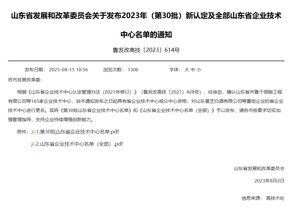 8月15日,山東省發(fā)展和改革委員會(huì)發(fā)布2023年山東省企業(yè)技術(shù)中心名單,公司憑借自身綜合創(chuàng)新能力成功入選,獲評山東省企業(yè)技術(shù)中心稱號。