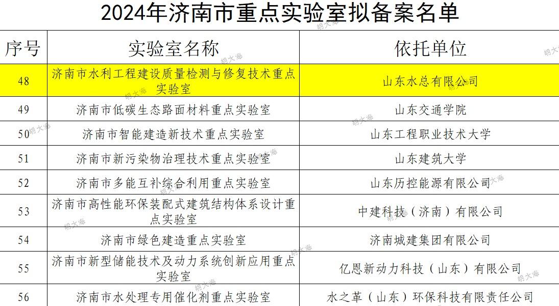 近日,濟南市科技局組織開展了2024年度濟南市重點實驗室備案工作。經(jīng)歷下區(qū)審核推薦、專家評審、現(xiàn)場考察、濟南市科技局黨組會研究,公司申報的濟南市水利工程建設(shè)質(zhì)量檢測與修復(fù)技術(shù)重點實驗室順利通過認(rèn)定。
