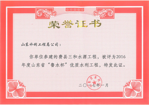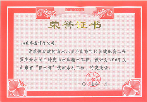 公司“招遠(yuǎn)市勾山水庫(kù)除險(xiǎn)加固工程”等八項(xiàng)工程被評(píng)為2016年度山東省“魯水杯”優(yōu)質(zhì)水利工程