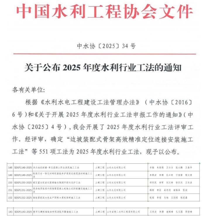 近日,中國水利工程協(xié)會正式公布2025年度水利行業(yè)工法評審結(jié)果,公司憑借在水利工程施工技術(shù)領(lǐng)域的持續(xù)創(chuàng)新與實踐積累,共有6項工法成功獲評,關(guān)鍵技術(shù)均達到國內(nèi)先進水平。