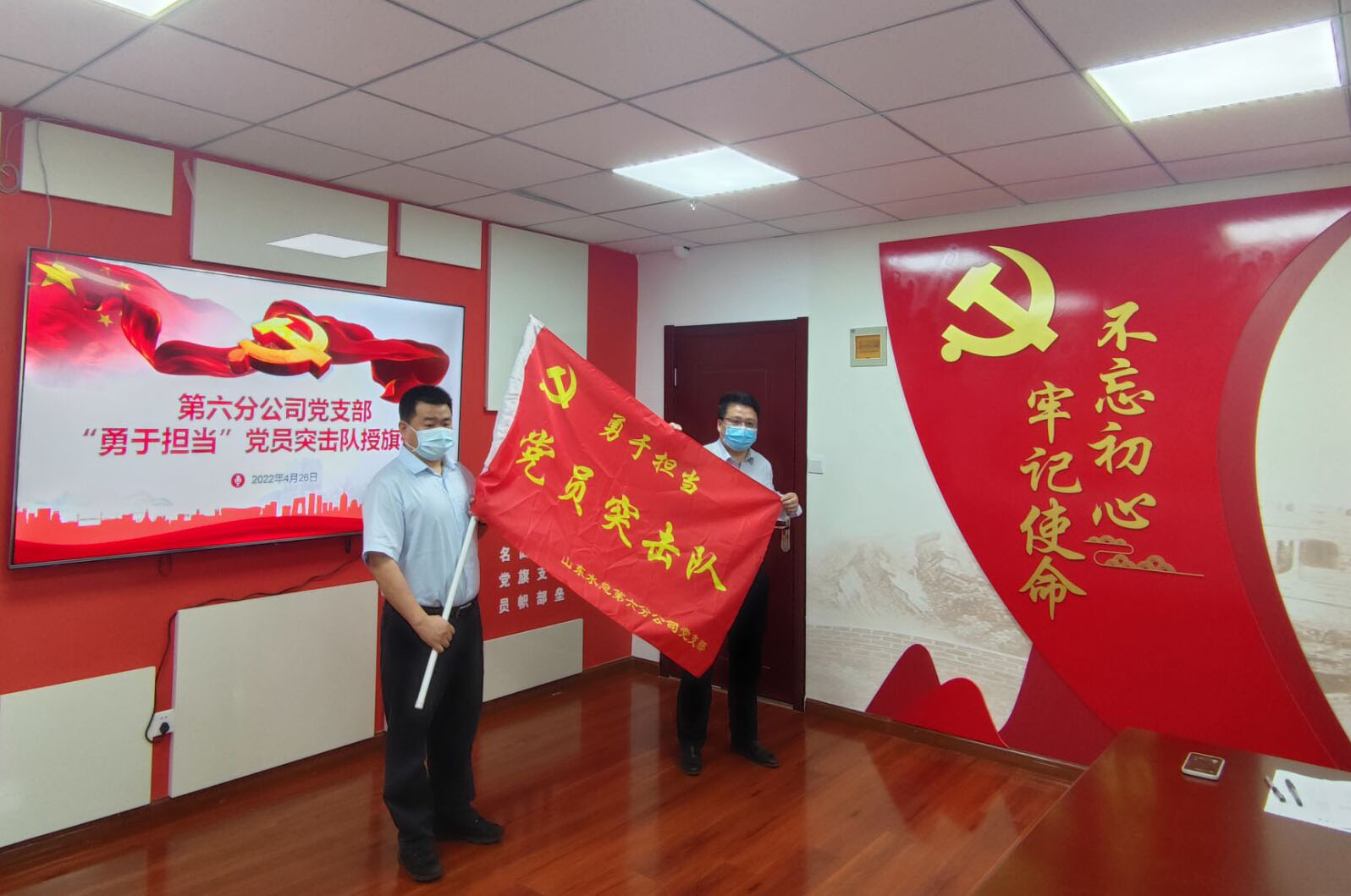 4月26日上午,第六分公司舉行“勇于擔(dān)當(dāng)黨員突擊隊(duì)”授旗儀式,以動(dòng)員激勵(lì)黨員在疫情防控、生產(chǎn)經(jīng)營(yíng)和安全生產(chǎn)工作中更好發(fā)揮先鋒模范作用。