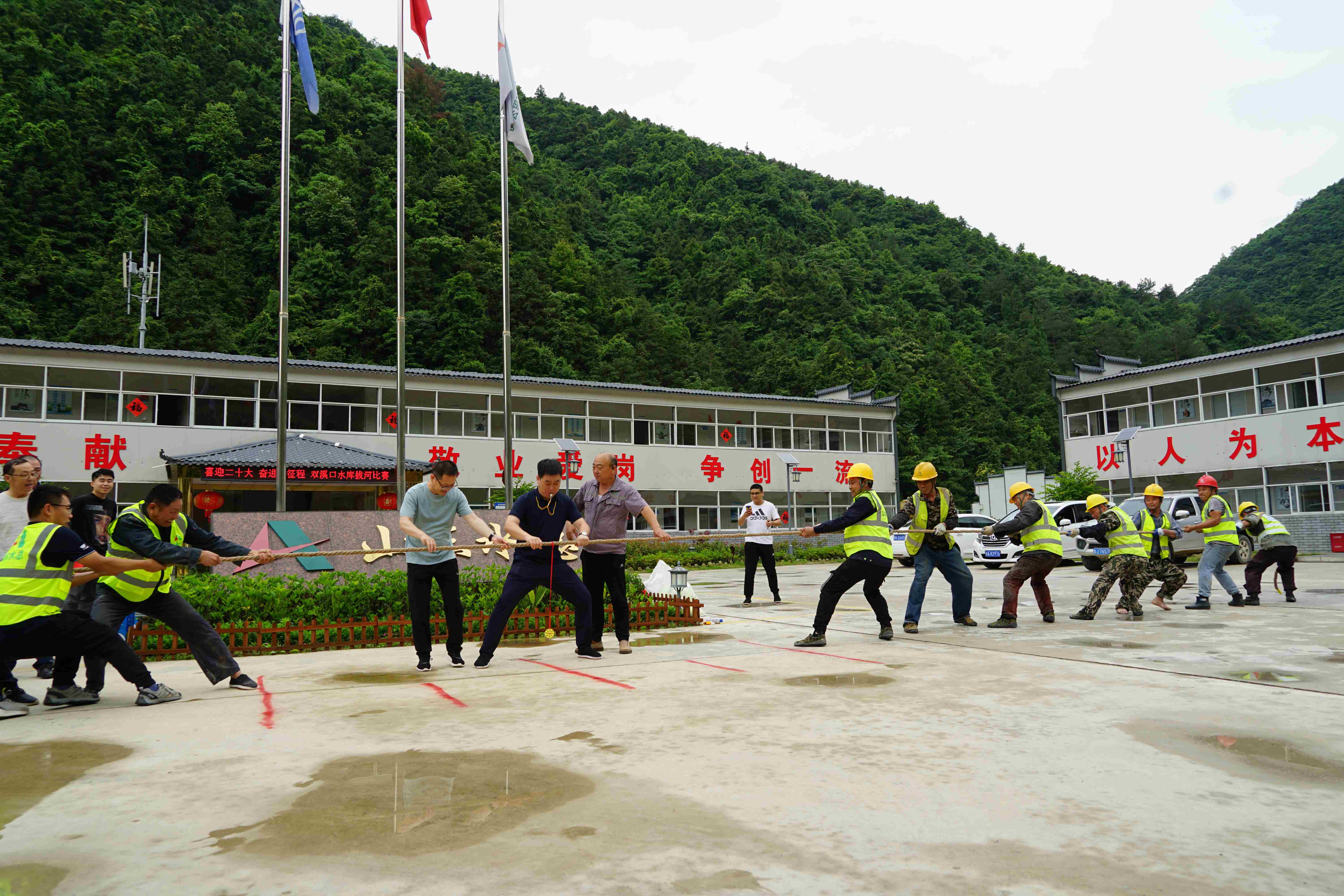 雙溪口水庫工程指揮部、杭州魯潤公司和監(jiān)理部組成藍隊,總承包項目部組成紅隊,施工班組組成黃隊。哨聲一響,選手們立即投入到激烈的比賽中,個個精神抖擻、全力以赴,周圍觀眾和工作人員使出渾身解數(shù)吶喊助威,賽場氣氛熱鬧非凡、緊張激烈,加油聲、歡呼聲此起彼伏。最后,經(jīng)過8輪的比拼,藍隊獲得本次拔河比賽的冠軍。